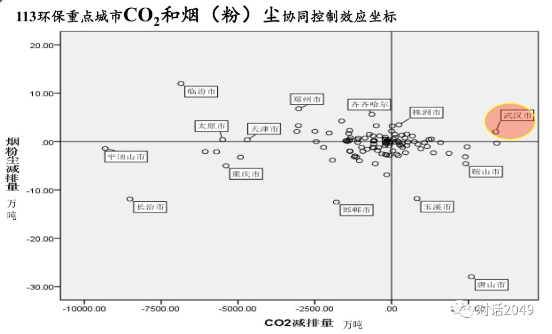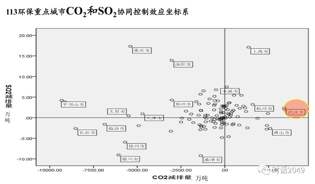 我们选取了113个环保重点城市的碳和二氧化硫减排情况,置于协同控制效应坐标系中。如图所示,武汉市减排措施得力,碳和二氧化硫出现了协同减排。表现最优的是上海市,协同减排效应遥遥领先。