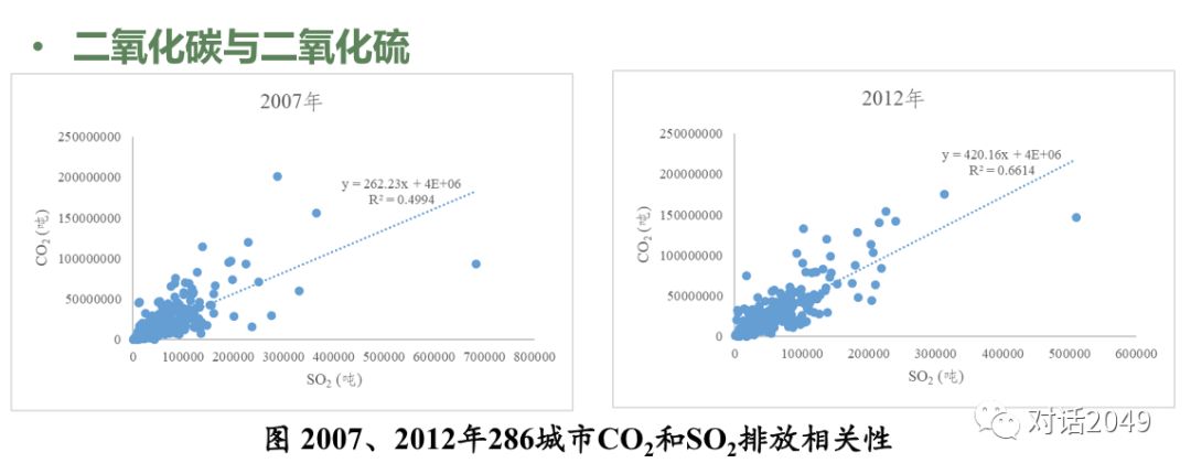 我们分析了286个地级市二氧化碳和二氧化硫排放的相关性,发现城市的碳与硫排放存在一定的正相关关系。