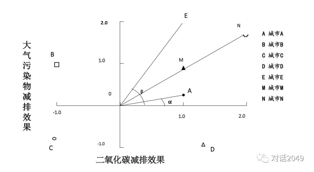 横坐标代表二氧化碳减排效果,纵坐标代表大气污染物减排效果。如果某城市出现在第一象限,意味着该城市能够同时实现两大类污染物的协同减排;出现在第三象限,说明该城市中两种污染物都是增排状态。出现在第二、四象限意味着两类污染物一增一减,不具协同效应。